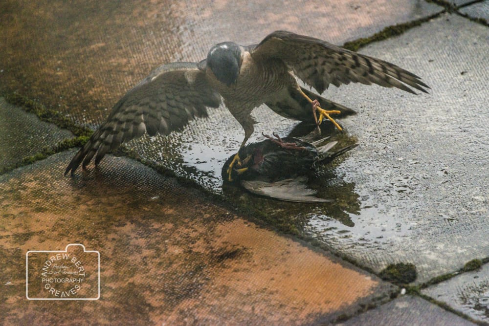 A sparrowhawk (Accipiter nisus) pinning down a starling (Sturnus vulgaris)