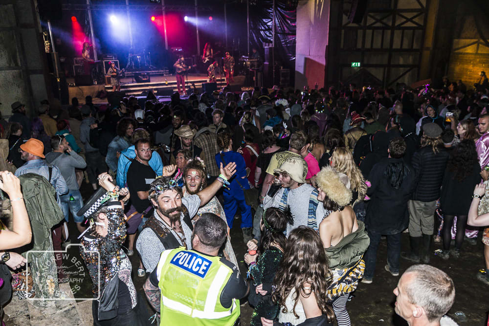 The crowd, including police, watching Duncan Disorderly & the Scallywags at Boomtown Festival 2017